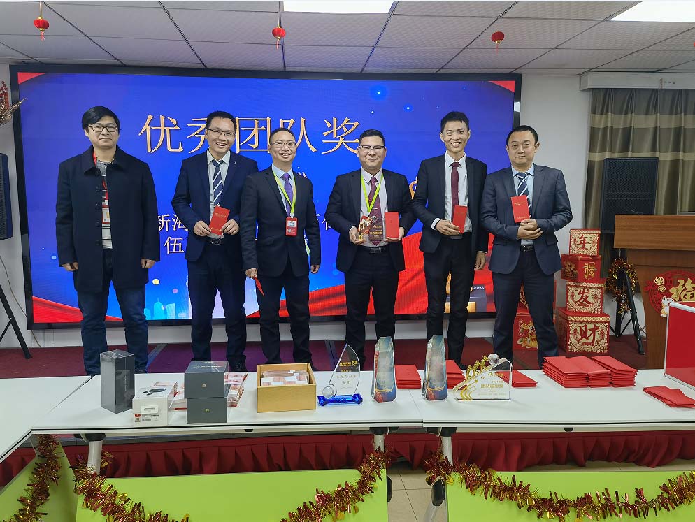 由優(yōu)秀團(tuán)隊(duì)獎(jiǎng)獲獎(jiǎng)?wù)啐徯潞#f仁唐,林孝和,伍飛飛,辜道歡上臺(tái)領(lǐng)獎(jiǎng),他們?yōu)檫@一年以來的努力奮斗和付出寫下了最完美的答卷!