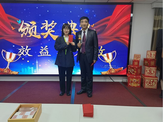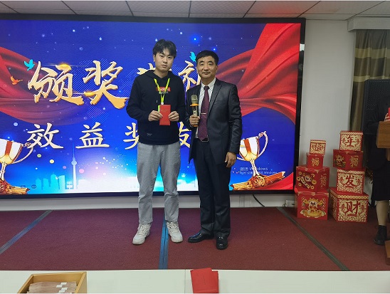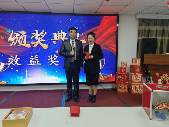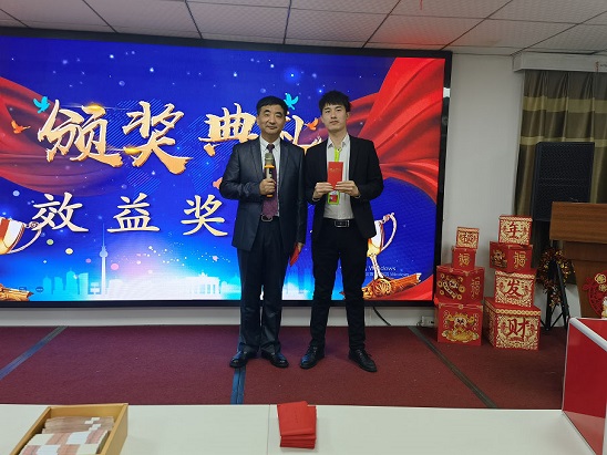每位員工上臺(tái)領(lǐng)取效益獎(jiǎng),楊總頒獎(jiǎng)