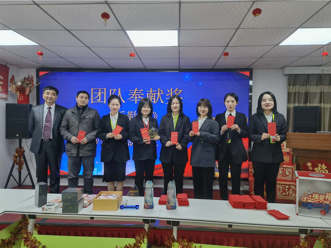 由團(tuán)隊(duì)奉獻(xiàn)獎(jiǎng)獲得者鄒雅芳,許灣灣,王宇茜,羅宇萱,胡清清,岳丹上臺(tái)領(lǐng)獎(jiǎng),楊總頒獎(jiǎng)