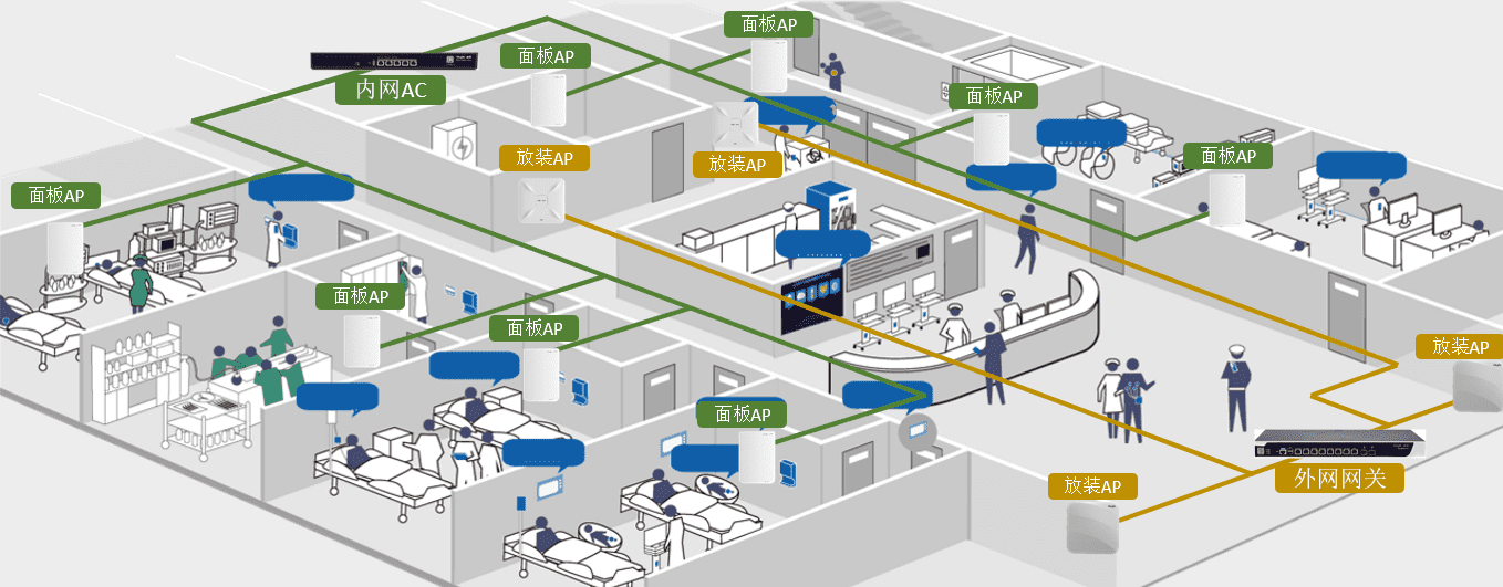 快速部署需求方艙醫(yī)院建設(shè)以速度快為主要特點(diǎn),應(yīng)保證供應(yīng)快、實(shí)施快,不能讓網(wǎng)絡(luò)實(shí)施拖了整體建設(shè)的后腿。無線接入質(zhì)量需求Internet出口應(yīng)滿足方艙醫(yī)院的醫(yī)患容量;如何保障在有限帶寬下,讓每個(gè)人都擁有公平網(wǎng)絡(luò)流量?如何應(yīng)對(duì)一些視頻類,大流量用戶問題?醫(yī)護(hù)人員和患者使用的手機(jī)品牌及價(jià)格不同,導(dǎo)致了具備的接入能力不同,如何為高中低端手機(jī)提供穩(wěn)定的WiFi接入更為關(guān)鍵;最后,要保障醫(yī)護(hù)人員和患者在移動(dòng)過程使用WiFi的良好上網(wǎng)體驗(yàn)。基礎(chǔ)設(shè)施齊全需求方艙醫(yī)院網(wǎng)絡(luò)基礎(chǔ)系統(tǒng)設(shè)施應(yīng)該齊備,保證內(nèi)網(wǎng)業(yè)務(wù)正常運(yùn)轉(zhuǎn)及患者基本所需,不應(yīng)出現(xiàn)缺失設(shè)備情況,投入使用后難以補(bǔ)救,造成損失。安全隔離管理需求投入使用之后的方艙醫(yī)院,尤其是污染區(qū)的隔離病房,屬于高危區(qū)域,一旦設(shè)備出現(xiàn)故障,運(yùn)維人員一般很難到達(dá)現(xiàn)場(chǎng)進(jìn)行維護(hù),因此,網(wǎng)絡(luò)設(shè)備應(yīng)支持授權(quán)遠(yuǎn)程運(yùn)維的功能,保障運(yùn)維人員對(duì)內(nèi)網(wǎng)設(shè)備進(jìn)行遠(yuǎn)程維護(hù)、升級(jí)。監(jiān)控承載需求監(jiān)控承載方艙內(nèi)外的安全任務(wù),方艙醫(yī)院內(nèi)有大量監(jiān)控點(diǎn)位,對(duì)網(wǎng)絡(luò)的大流量承載能力提出需求。同時(shí),監(jiān)控點(diǎn)位的部署還要考慮醫(yī)患的隱私。