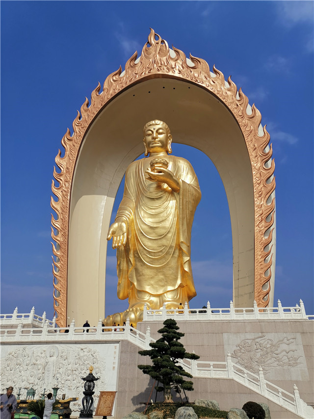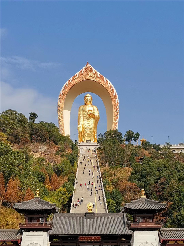 金秋的陽(yáng)光溫馨恬靜,金秋的微風(fēng)和煦輕柔,金秋的藍(lán)天白云飄逸,金秋的田野遍地金黃。團(tuán)建第三天,我們來(lái)到了九江星子縣瞻仰世界最高48米大佛--東林大佛。經(jīng)了解,大佛北依廬山主峰,群山環(huán)抱,山水相連,彌陀壇城,凈宗道場(chǎng),朝圣勝地,是一方集朝圣、修行、弘法、教育、慈善為一體的凈土。高度48米,以表阿彌陀佛發(fā)的四十八大愿。總高81米,為至火焰寶蓋頂點(diǎn)之距,81米,以表九九八十一,意為修行成佛艱辛不易。在阿彌陀佛像里面,是中國(guó)及全球第一高的。我們帶著無(wú)比虔誠(chéng)的心瞻仰著。此刻的心靈,猶如明鏡一般清澈、透明,遠(yuǎn)離塵囂!