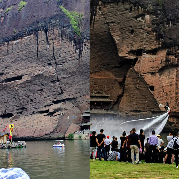 竹筏到了仙水巖景區前一段比較開闊的河面,我們也下了竹筏,觀看場景演出。空中飛人的水上表演,上下翻滾,騰云駕霧,蛟龍出水,哄托了現場的整個氣氛。鸕鶿捕魚、采仙草、仿古升棺等表演,讓你在復原的場景中真正體會到傳統的勞作、勇敢的山民和未解的千年之謎的無窮奧妙。