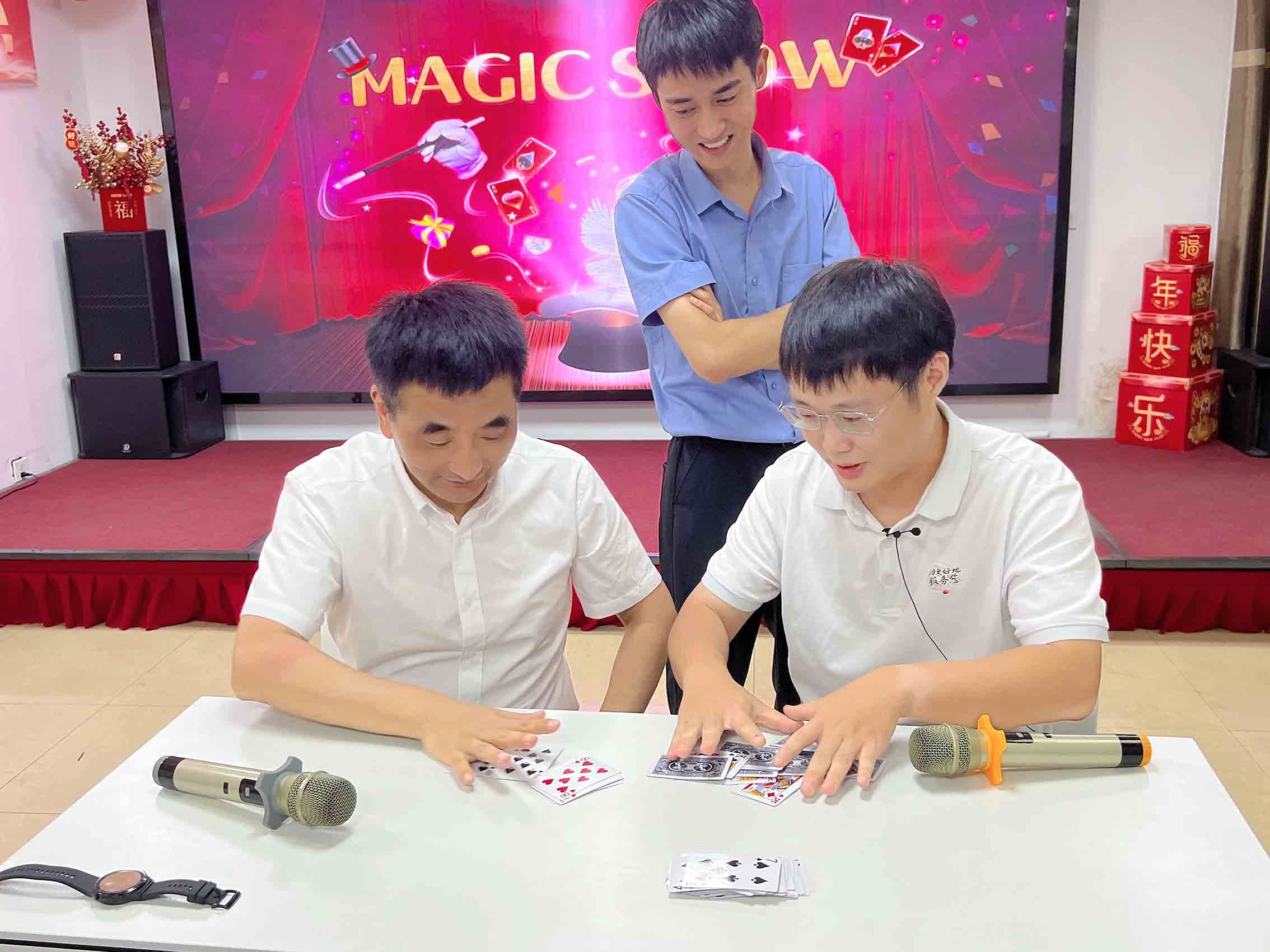 緊接著,售后部的同事化身為魔術師,手持一副普通的撲克牌,卻仿佛擁有了讀心術一般。在觀眾的注視下,他特意邀請了我們總經理上臺參與互動。魔術師先讓總經理隨機選取一張牌并牢記,隨后將牌放回牌堆中洗牌。令人驚奇的是,無論牌堆如何被打亂,魔術師總能猜出牌面。